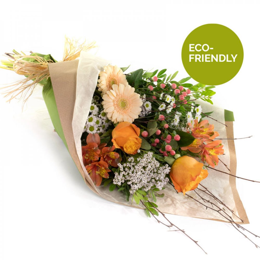 Flowers in shades of Orange/peach and white simply wrapped in paper or your choice with no cellophane.
